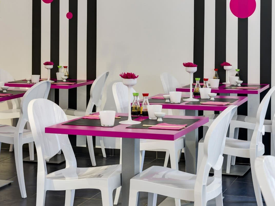 Ресторан японской кухни Sushi World. Белый и черный цвета оттенены яркой фуксией. Яркие цвета характеризуют всю обстановку Sushi World Лувен-ла-Нев в Бельгии. Типичная японская кухня и элегантный функциональный дизайн стульев Igloo делают ресторан невероятно привлекательным для посетителей.